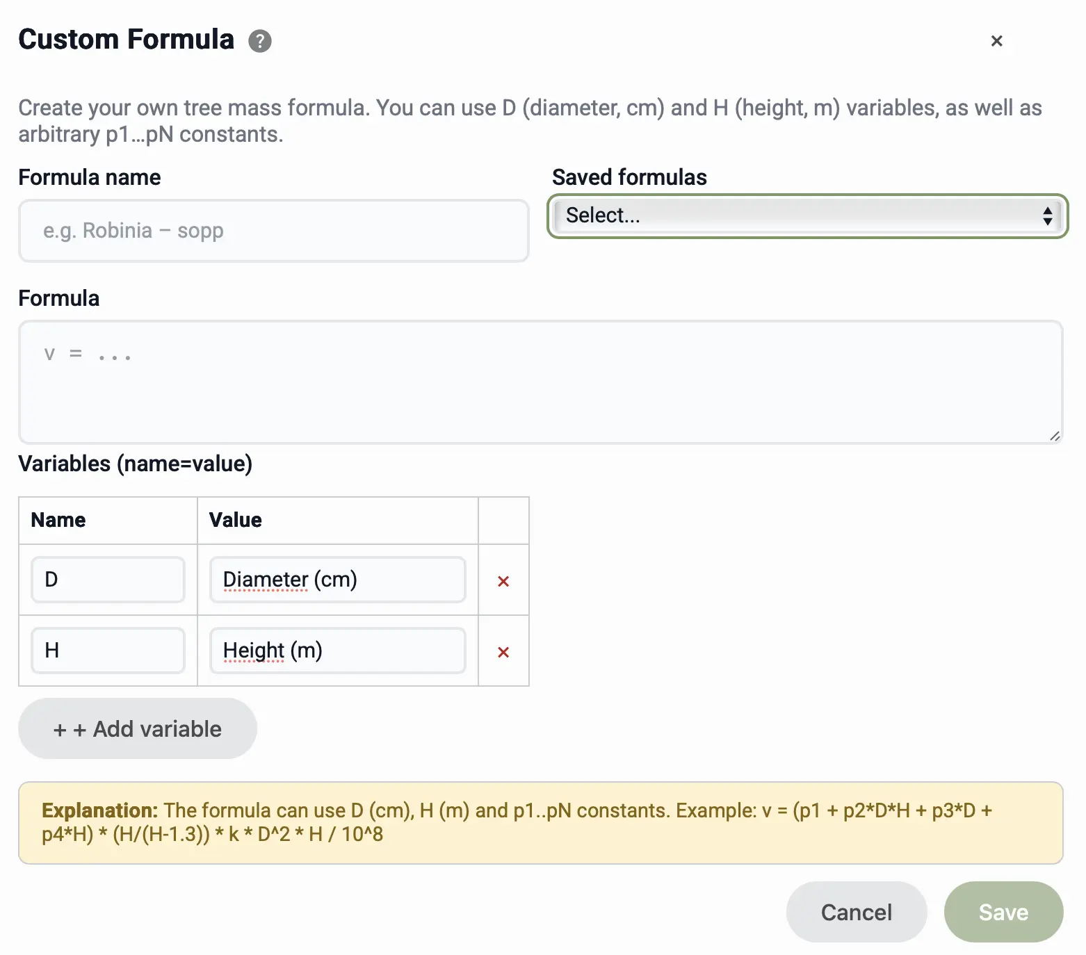 ✅ Advantage: The custom formula feature allows TreeDetect to support personalised forestry calculations, giving the user full control over the calculation model. Custom formulas can be saved and reused in future surveys with a single click.