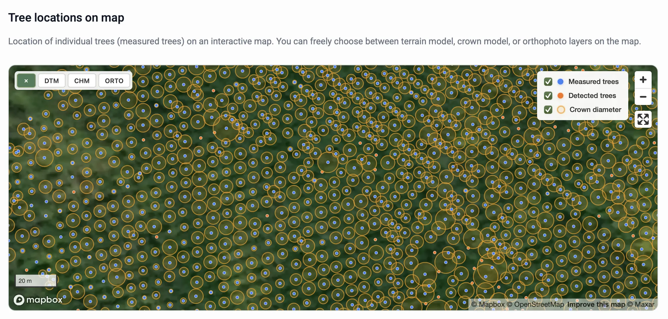 A TreeDetect teljes fakataszter szolgáltatás célja, hogy a feltöltött LiDAR vagy fotogrammetriai adatok alapján egyedileg azonosítsa és mérje az összes fát a kijelölt területen.