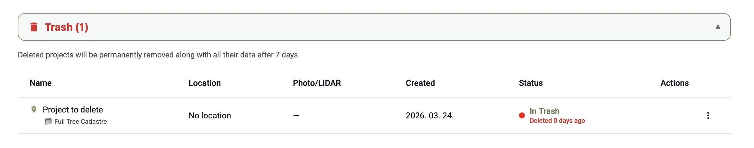 - Törlés: a projekt a Törölt mappába kerül, ahonnan 7 napig visszaállítható, illetve véglegesen törölhető. 7 nap elteltével a projekt automatikusan és visszavonhatatlanul törlődik.
