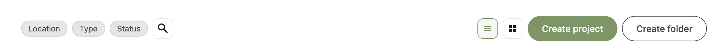 A rendszer a projektek és mappák áttekinthető kezelését biztosítja. A fő nézetben elérhető a lista és a kártya elrendezés, gyors szűrők, kereső, valamint a projekt és mappaműveletek.