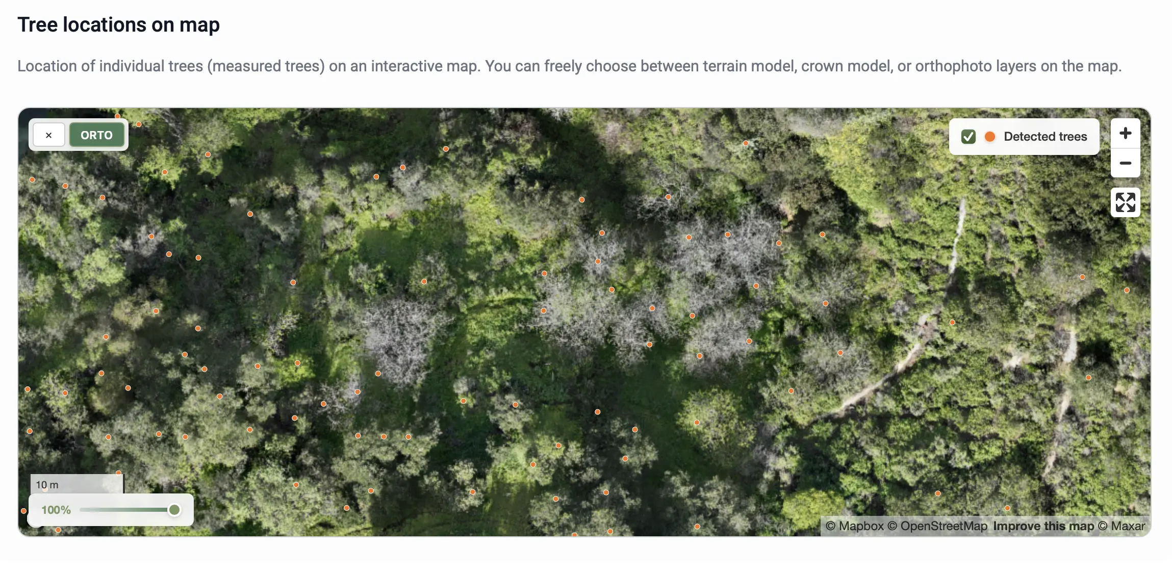 Mindkettő az erdőfelmérés alapját képező, georeferált .tif formátumú állományként tölthető le, és interaktívan is megtekinthető a riportfelületen.